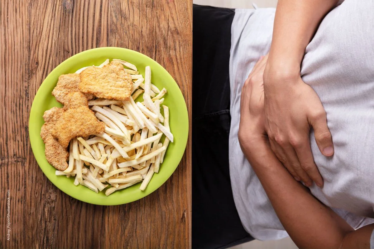Schmerzen im mittleren Oberbauch und Völlegefühl nach ungewöhnlich üppigen oder rasch eingenommenen Mahlzeiten, evtl. Übelkeit, Erbrechen